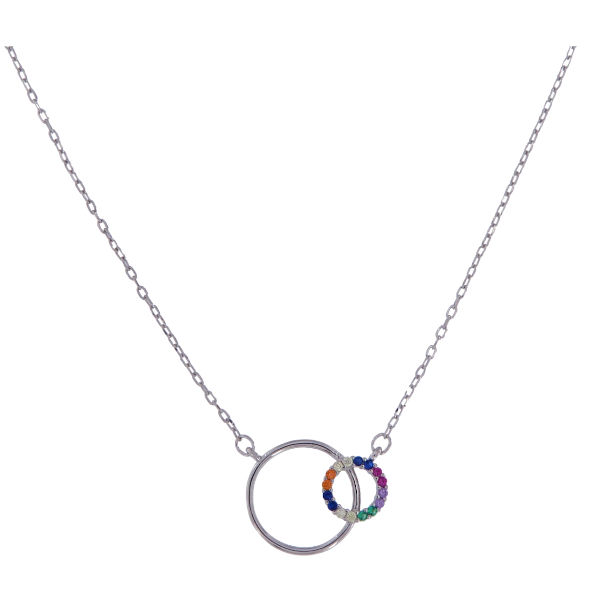 Gargantilla de plata con una largura de 40 cm y extensible 5 cm, con un colgante central compuesto por dos círculos, uno círculo de circonitas de color y otro liso.