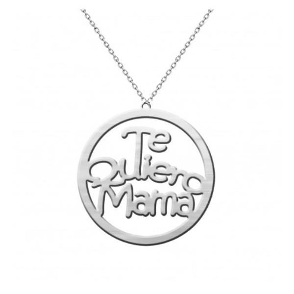 Gargantilla de plata y colgante con la frase «Mamá te quiero» grabada en letra redonda en el interior de un círculo de plata.