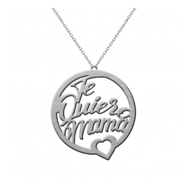 Gargantilla de plata y colgante con la frase «Mamá te quiero» grabada en letra cursiva en el interior de un círculo de plata que cierra con una figura en forma de corazón.